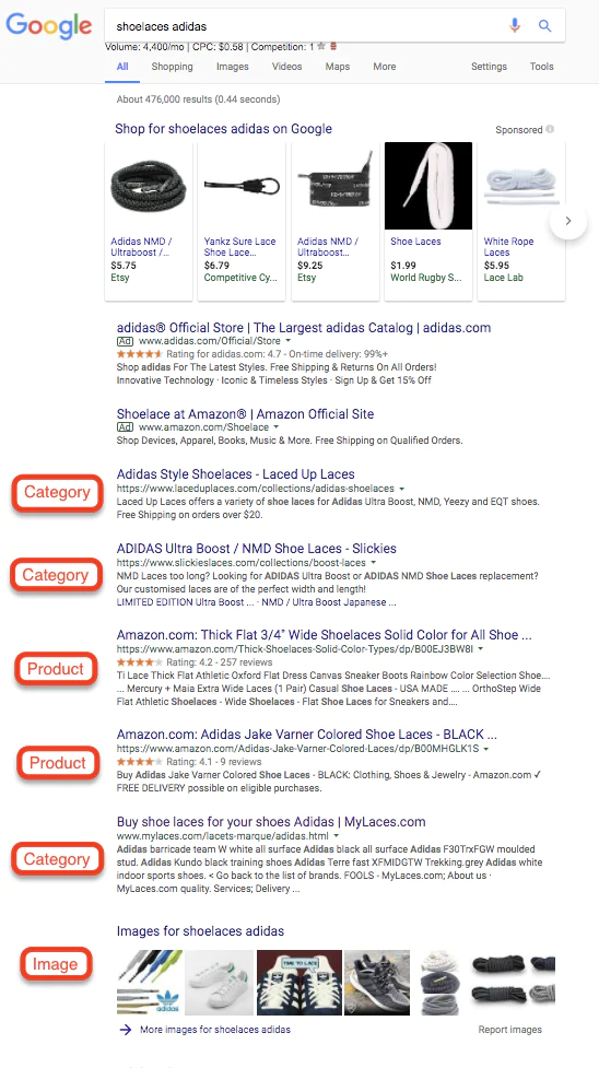 この3番目の例では、結果が商業目的の高いページに偏っていることがすぐにわかります。 最上部(テキスト広告の前)に商品リスト広告(PLA)カルーセルがあり、画像結果が表示される前に、2つの商品カテゴリページ、2つの商品詳細ページ、および別のカテゴリページが表示されます。