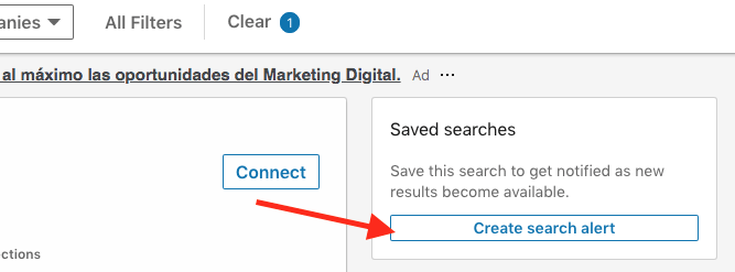 より良いオプションは、LinkedInの検索アラートを使用することです。 他の種類の検索アラートを使用したことがある場合は、これらをすばやく設定できます。 必要な検索を実行し(具体的であるほど良い)、検索結果の右側にあるボックスの[検索アラートの作成]オプションをクリックします。 その後、LinkedInは、その検索の新しい結果のダイジェストを毎週送信します。