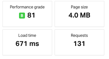 Pingdom では、私のサイトのパフォーマンス グレードは 81、4.0 MB でした。 ページ全体はわずか 671 ミリ秒でロードされ、非常に高速です。