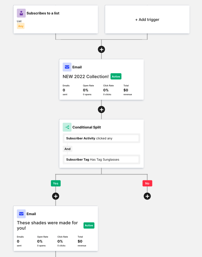 - トリガーの自動化:タグは、自動化のどの部分でもトリガーとして使用できます。 たとえば、新しい2022コレクションについて連絡先に警告する自動化を実行するとします。 そのタグ「サングラス」を持つサブスクライバーが電子メールを開くと、数日後に主にあなたの色合いに焦点を当てた別のターゲット電子メールを自動的に受信するように自動化を設定できます。