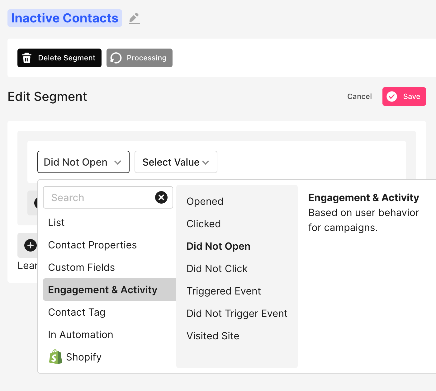 Sendlaneでは、さまざまな要因に基づいてセグメントを作成できます。 ダッシュボードの[セグメント]タブを開くと、多数のオプションを含むドロップダウンメニューからセグメンテーション基準を選択できます。