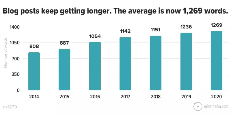 Orbit Media は、 1,000 人のブロガーを対象に毎年調査を実施し、ブログ統計の投稿を作成しています。 最新のレポートによると、平均は 2014 年の 808 語から 2020 年には 1,269 語に増加しました。