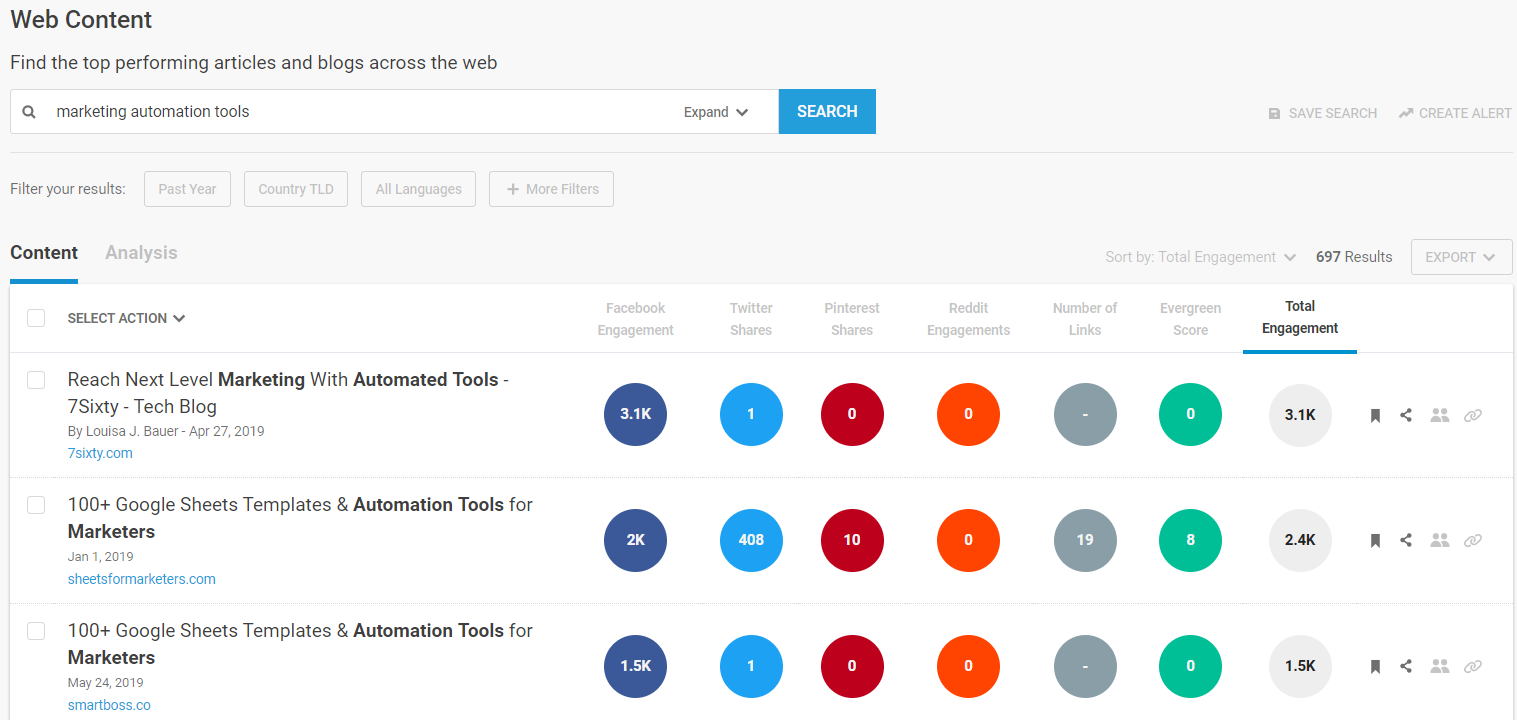 コンテンツマーケティングの世界で活動している場合、BuzzSumoなどのツールは、キーワードに基づいて業界で最も優れたコンテンツを理解するのに役立ちます。 ここでは、関連する業界サイトとインフルエンサー、および業界内のどのブランドがエンゲージメントとシェアの点で最も話題になっているのか、どのソーシャルネットワーク上にあるのかを確認できます。