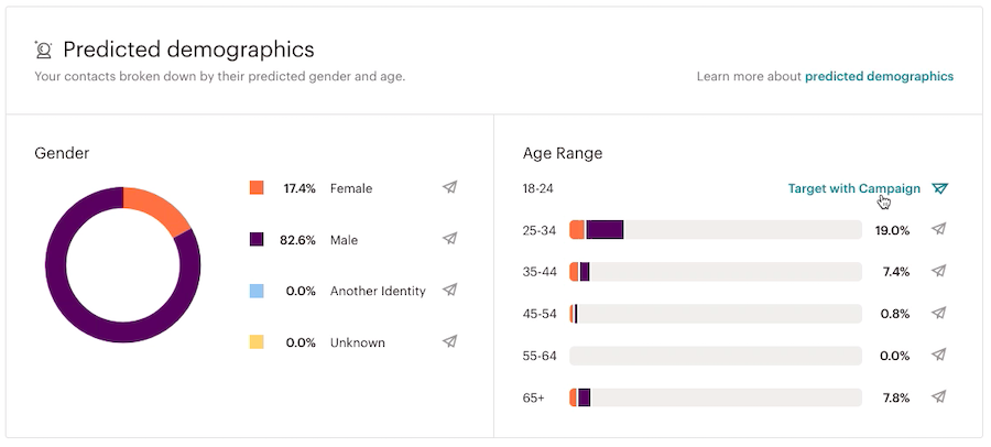 あなたはおそらく、あなたの理想的な顧客が人口統計学的にどのように見えるかについての大まかな考えをすでに持っているでしょう。 有料広告を掲載することで、人口動態のターゲティングが適切かどうかをさらに知ることができます。 たとえば、MailChimpの予測人口統計などのツールは、マーケティングキャンペーンの過去のパフォーマンスに基づいてこの情報を強調表示できます。