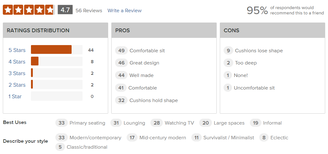 B2Cブランドの場合、ブランドからの製品レビューを掘り下げることで、物理的な製品が顧客にとって魅力的なものになる理由を知ることができます。 Room&Boardによるこの製品レビューでは、たとえば、顧客が気に入った(そして嫌った)特定の詳細を紹介しています。