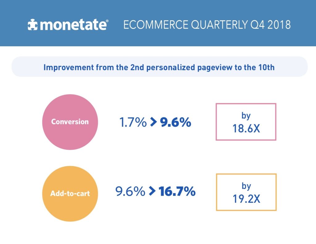 さらに重要なことに、パーソナライズはコンバージョン率にも役立ちます。 実際、Monetateのレポートによると、顧客が3つのパーソナライズされたページをターゲットにした場合、コンバージョン率は2倍になり、10のパーソナライズされたページにさらされた場合、コンバージョン率は31.6%に跳ね上がりました。
