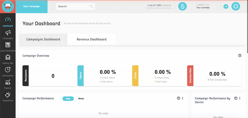 - Free Foreverプランは永久に無料で、最大1,000人のユニークなサブスクライバーを対象としています。 つまり、1つのメールアドレスが1つとしてカウントされるため、無制限のメールを送信し、必要な数のメーリングリストを作成できます。 まだすべてのマーケティングツールを必要としないSMB、起業家、ソロプレナーがビジネスを成長させるのに最適です。