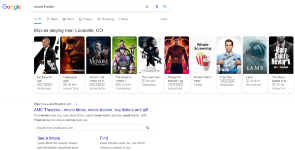 この Google 検索結果では、AMC シアターズは見出しを使用して、訪問者が Web サイトでできることを説明し、この情報をメタ ディスクリプションで詳しく説明しています。 限定公開のインディペンデント映画を上映する場合や、劇場にリクライニング シートがある場合など、違いを強調するために使用します。