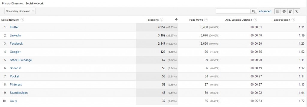 「Acquisition」の下にあるGoogleAnalyticsの「Social」セクションには、Stack Exchange、Pocket、StumbleUponなどのサイトを含むさまざまなソーシャルネットワークからのサイト上のセッション数の内訳が表示されます。 [ネットワーク参照]タブで、各サイトからのページビュー数、およびそのネットワークからの訪問者の平均セッション期間とセッションあたりのページ数に関するデータを確認できます。