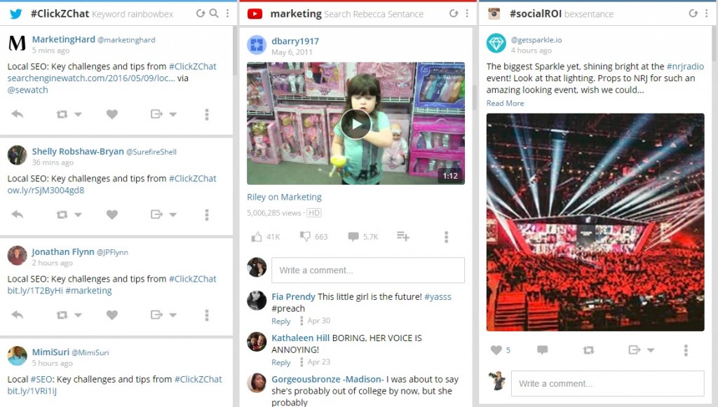 また、複数のソーシャルネットワークからキーワード、ハッシュタグ、検索用語を一目で監視できる「ストリーム」と呼ばれる便利な機能もあります(ただし、無料のHootsuiteアカウントに登録できる最大数は3つです)。 Hootsuiteは、Twitter、Facebook、Instagram、LinkedIn、Google +ページ、およびWordPressとYouTubeをサポートしています。