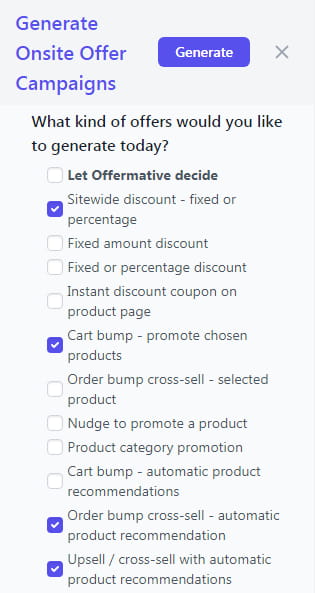 リストから作成する複数のオファーを選択できます。 サイト全体の割引、カートバンプ、注文バンプ、アップセル、クロスセル。 または、[ Offermativeに決定させる]オプションを選択して、Offermativeが一連のオファーを作成できるようにします。 このオプションを選択することをお勧めします。