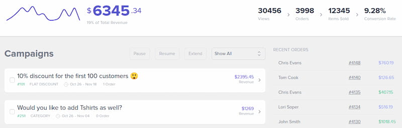 ダッシュボードからすべてのオファーキャンペーンを管理できます。 ここから、すべてのキャンペーンを一時停止、再開、または延長できます。