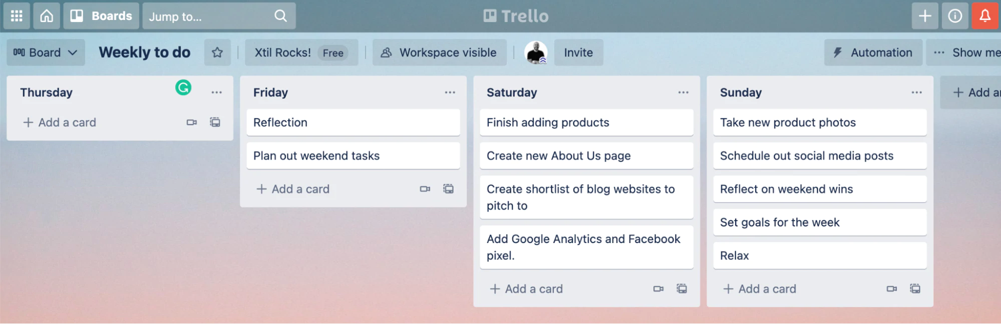 これが私のTrelloボードの「Weeklytodo」の例です。