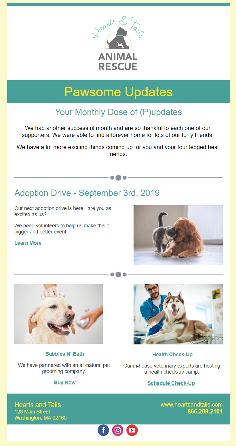 マスター テンプレートを使用すると、次のニュースレターを送信する準備ができたら、新しいコンテンツと関連する画像を入力するだけです。 これにより、ブランドの認知度を高め、購読者がメールをすぐに認識できるようになります。