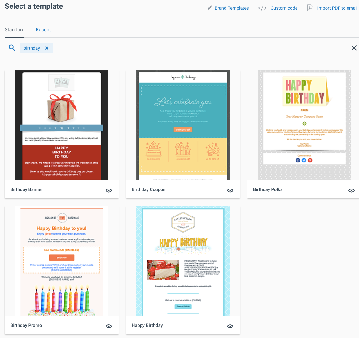 誕生日に電子メール購読者のそれぞれに自動化された電子メール キャンペーンを送信することを計画しているとします。 テンプレート ピッカーで、検索バーに「誕生日」と入力すると、キャンペーン用にカスタマイズできる誕生日をテーマにしたさまざまなテンプレートが表示されます。