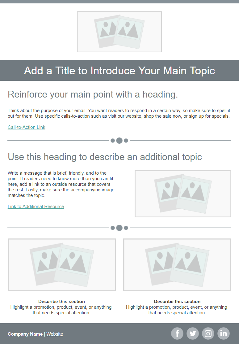 重要な情報を強調する電子メール テンプレートを使用し、各コンテンツを専門的かつ強力に提示します。