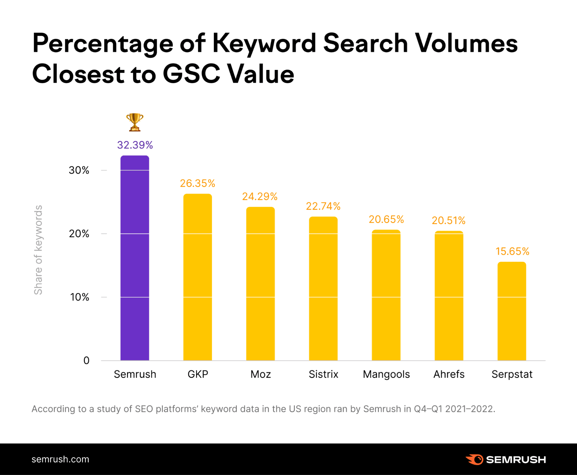 そのため、Semrush のキーワード データ統計を他のソリューション (Google Keyword Planner、Moz、Mangools、Ahrefs、Serpstat、および Sistrix) と比較したある調査結果をお見せしたいと思います。