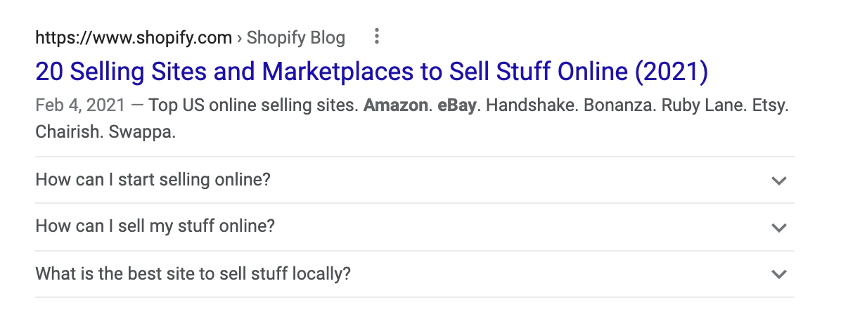 たとえば、「オンライン販売サイト」にランク付けされているこのShopifyの記事では、スキーママークアップを使用しています。