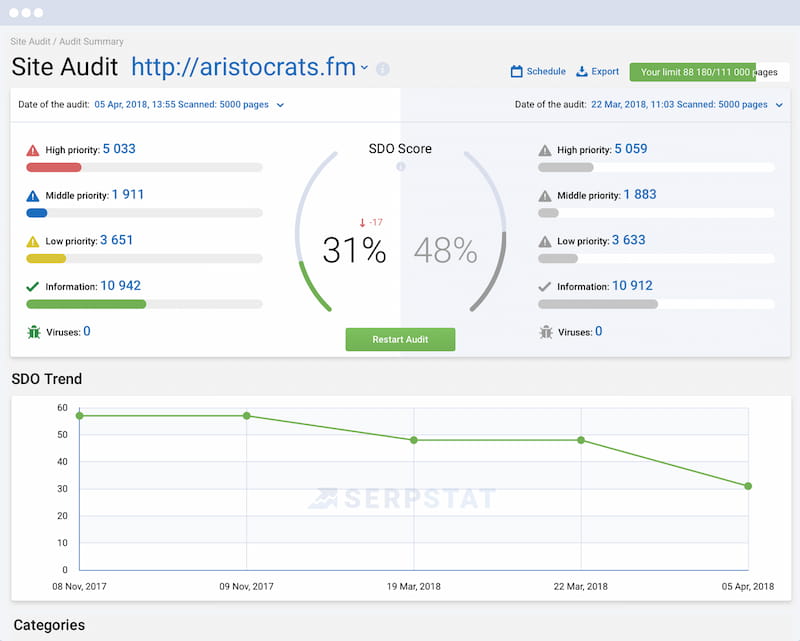 Serpstatは、ユーザーに独自の機能を提供します。これにより、ユーザーは、特定のページで発生するすべてのタイプの技術的エラーをチェックできます。 「サイト監査」というラベルの付いたこのオプションは、ユーザーにとって非常に重要な便利で機能的な機能です。