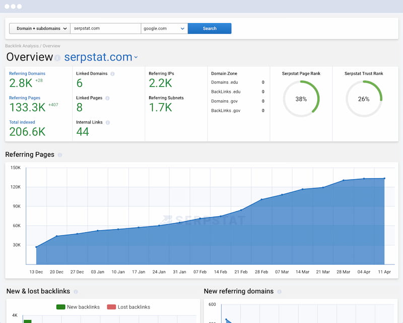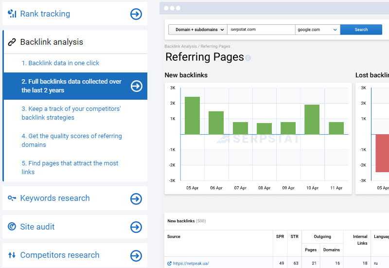 バックリンク分析ツールはSerpstatの重要なツールであり、競合他社のバックリンクプロファイルの全体像を提供します。 この一部として、あなたは見ることができます: