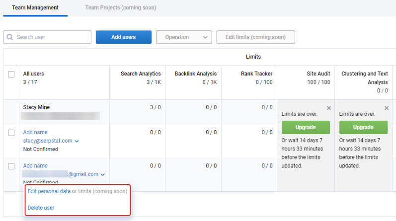 チーム管理モードの初期バージョンは、ユーザーのタスクの監視、制限の配布、およびチームビルディングを目的としていました。 時間の経過とともに、Serpstatは、チーム履歴の監視を考慮したチーム統計タブでチーム管理を更新しました。