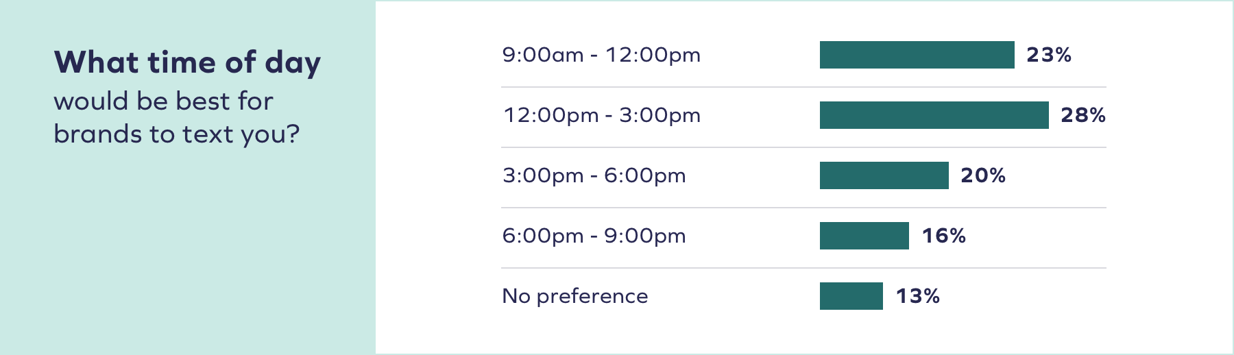 それは適切なタイミングでメッセージを送信することも重要です、あなたの顧客に適切なメッセージを送信することだけが重要ではありません。 買い物客に、ブランドがテキストメッセージを送信するのに最適な時間帯を尋ねました。これにより、テキストメッセージはいつでも歓迎され、煩わしくなりません。