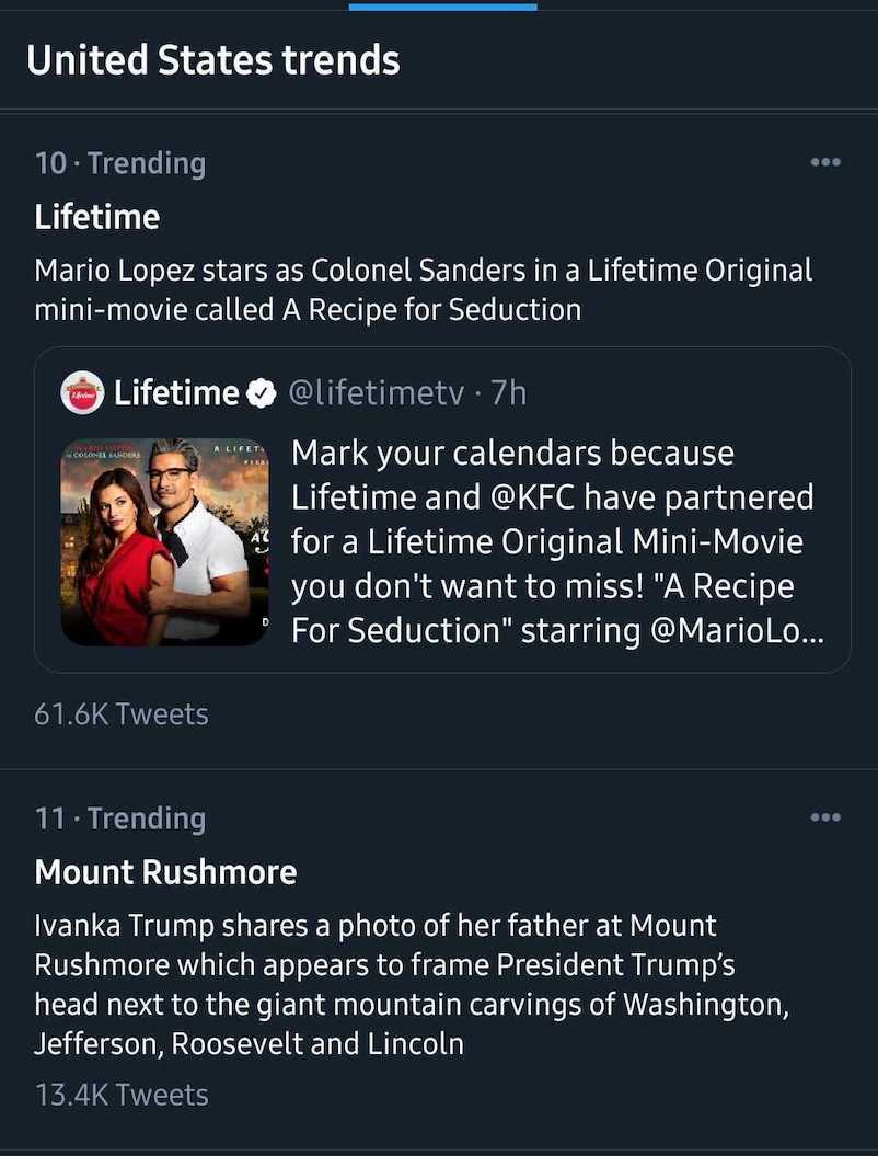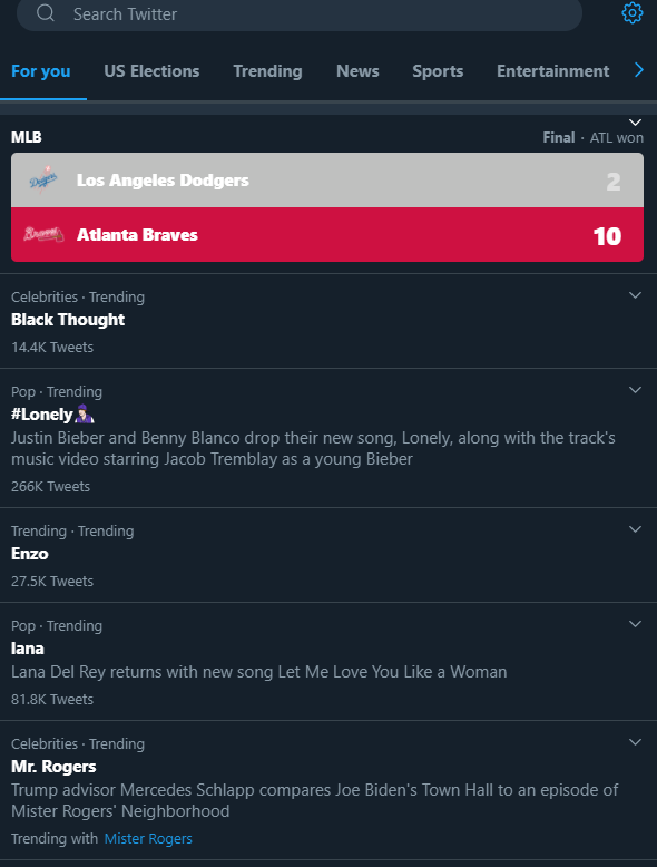 これは、プラットフォームで人々が話していることを明らかにするための優れた方法です。 Twitterはあなたの興味や活動に基づいて「ForYou」のトレンドをパーソナライズしているため、ほとんどの場合、ブランドや業界に合ったトピックが表示されます。 その関心領域の外を見たい場合は、地域別または他のサブトピック別にトレンドを確認できます。