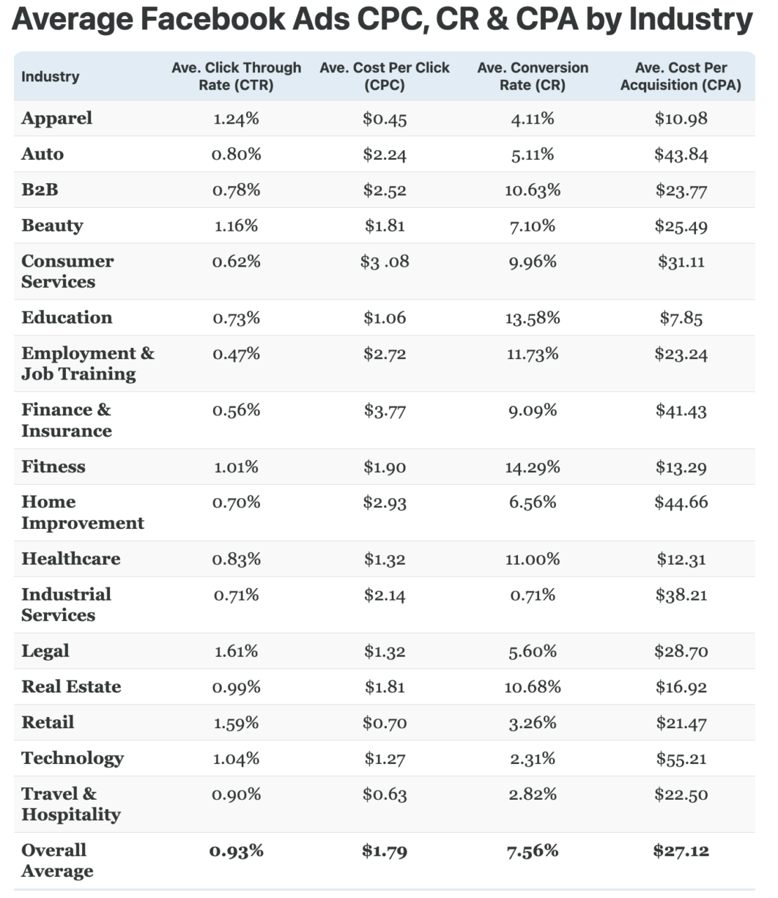 業界別の Facebook 広告の平均 CPC、CR、CPA