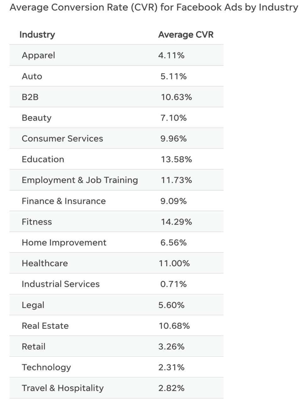 Facebook 広告は安いと言いましたか? 安いだけでなく、強力な変換レートも実現します。 対照的に、Google 広告のすべての業種でコンバージョン率は 5% と予想するのが一般的です。 Facebook は平均してそのほぼ2 倍です