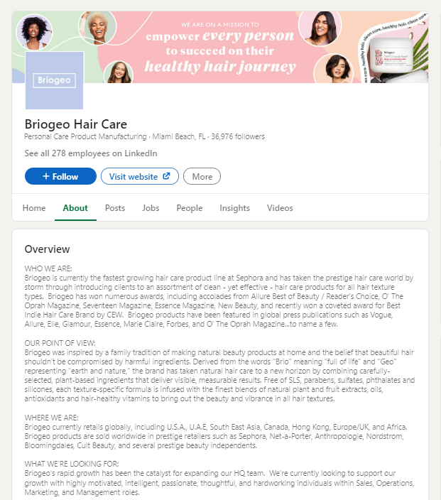LinkedIn は求職者にとって一般的なリソースでもあるため、顧客ベースを超えて、将来の従業員向けの情報を含めることを検討してください。 リンクは説明セクションでは機能しないことに注意してください。ただし、別のフィールドにリンクを追加することはできます。
