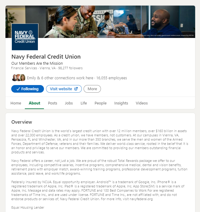例として、Navy Federal Credit Union の LinkedIn 企業ページをご覧ください。