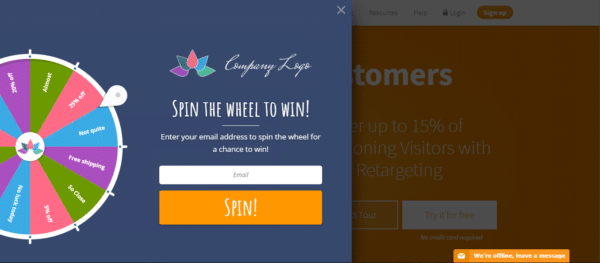 ゲーミフィケーションを使用するミニコンテストの一例は、「ラッキーホイールスピン」です。これは、特にeコマースストアでオンラインで注目を集めるコンセプトです。 OptinMonsterのこれのバージョンは次のようになります。
