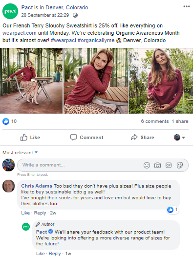 たとえば、次のスクリーンショットは、PactがFacebookの投稿に対する顧客のコメントから製品改善の機会を特定する可能性があることを示しています。