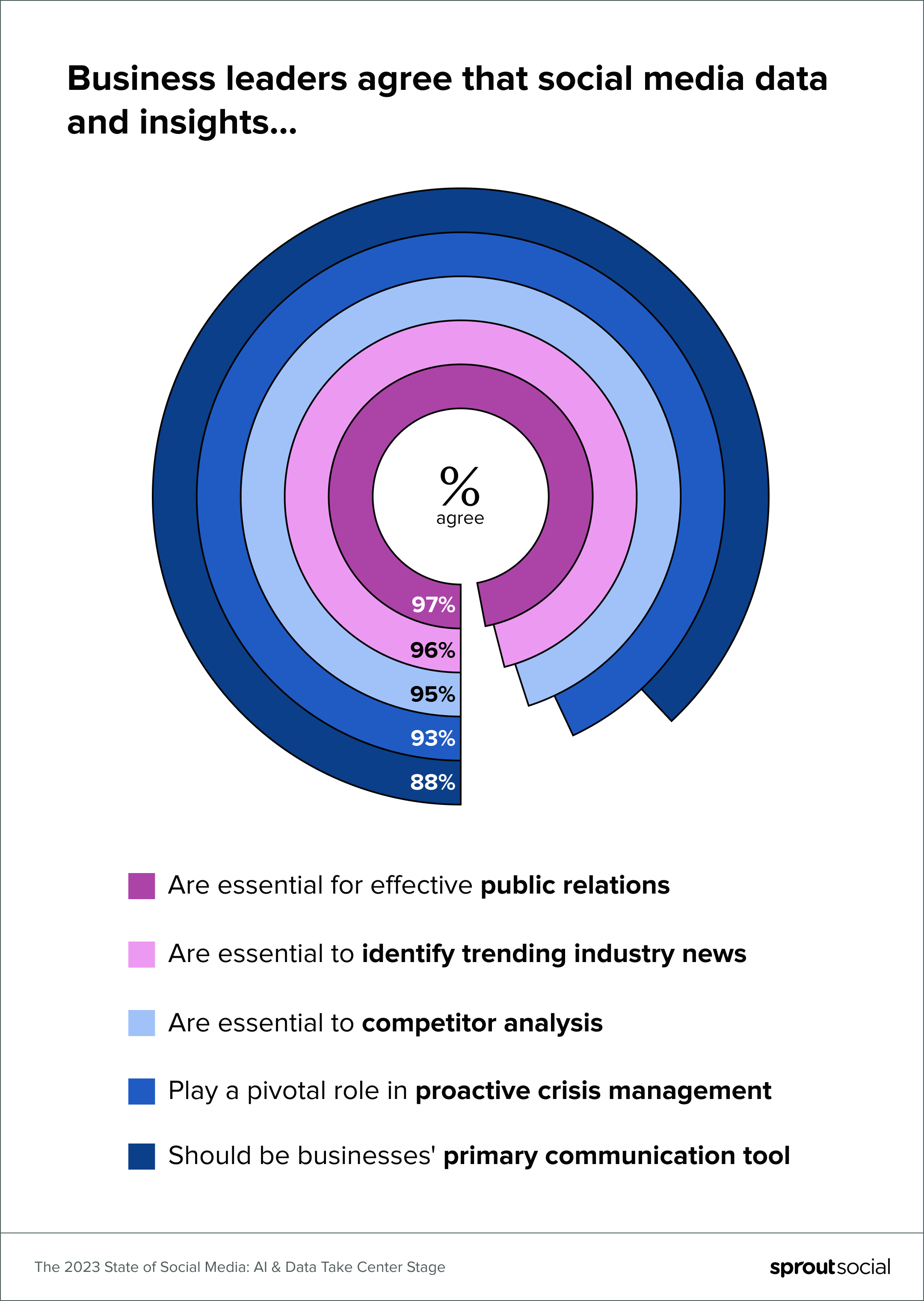 ソーシャル メディア データ収集には、組織のあらゆる領域に及ぶ広範囲にわたる利点があります。 2023 年のソーシャル メディアの現状レポートによると、ほとんどのビジネス リーダーは、ソーシャル メディアのデータと洞察が、PR、トレンドスポッティング、競合他社の分析、プロアクティブな危機管理、コミュニケーション機能など、企業全体で極めて重要な役割を果たしていることに同意しています。