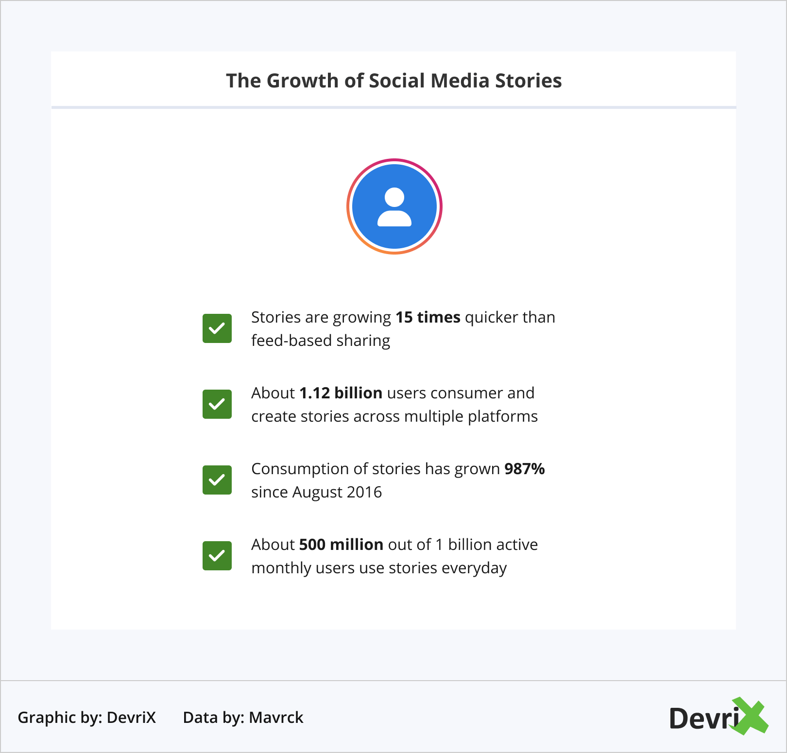 Snapchatによって開拓され、その後Instagramによって普及したソーシャルメディアのストーリーは、「通常の」スクロールフィード形式に挑戦します。 Mavrckによると、ストーリーはフィードベースの共有と比較して15倍速く成長しています。 約11億2000万人のユーザーが、Instagram、Facebook、Snapchat、LinkedIn、YouTube、最近ではTwitterなど、複数のプラットフォームでストーリーを消費および作成しており、2016年8月にInstagramに初めて登場して以来、987%の成長に貢献しています。