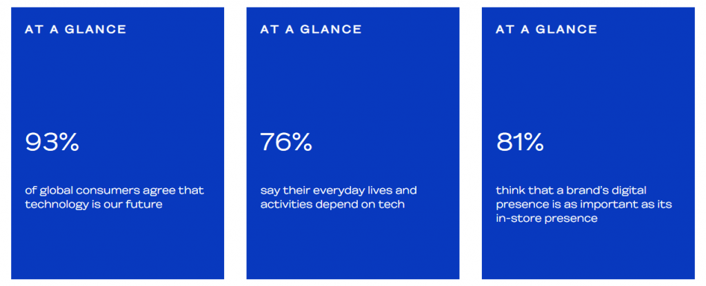 マーケティングの観点から、世界の消費者の93%はテクノロジーが未来であると考えており、76%は日常生活でテクノロジーに依存していると述べています。