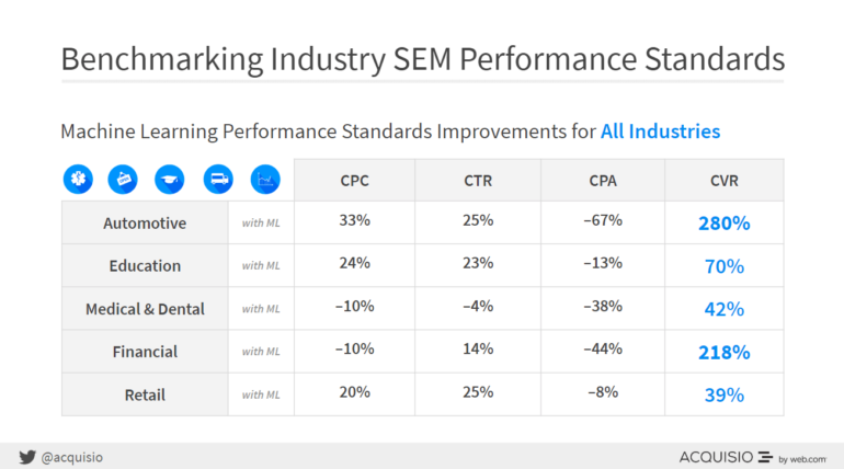 AcquisioのMarcPoirierは、Hero Conf Londonで発表した調査で、大量の有料検索アカウントで機械学習を使用した場合と使用しない場合のキャンペーンのパフォーマンスを比較して、その質問に良い答えを出しました。 「採用者」セグメントは、自動車、教育、医療、金融、小売に属する業種に応じて、39〜280%高いコンバージョン率を経験しました。