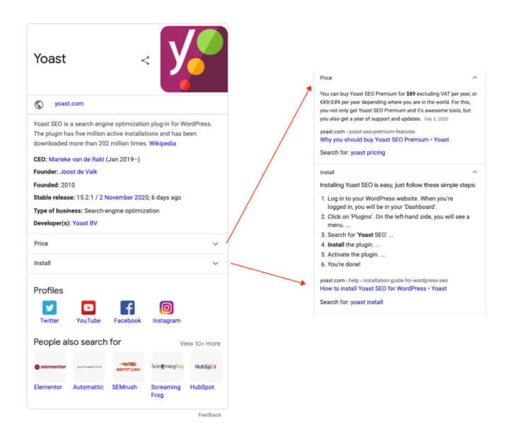 ブランドがこれらのエンティティステートメントを所有することは自然な(そして比較的単純なタスク)はずです。 たとえば、Yoastは、ナレッジパネルに両方の質問を所有しています。