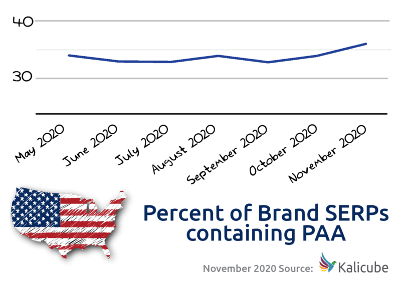 ブランドSERPのメインの列では、おそらく多くの人が認識しているよりも一般的です。 過去6か月間、その存在感は安定しており、米国でのすべてのブランド検索の約3分の1に表示されています(これらの数字は、英国、IE、CA、AU、およびNZ)。 11月には、その割合はわずかに上昇して36%に達しました。