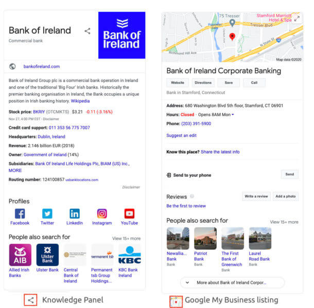 この記事の文脈では、私は知識パネルを意味し、Googleマイビジネス(GMB)パネルを意味するのではなく、類似しているように見える場合があることに注意してください。 下の画像では、アイルランド銀行のナレッジパネルが表示され、右側には、GMBのリストが表示されています。