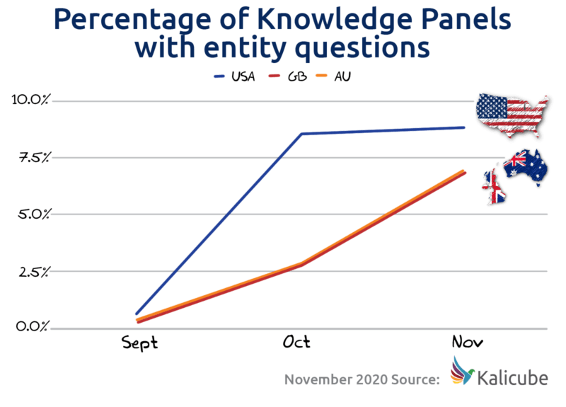 10月、ナレッジパネルのPAAボックスは、米国ではほぼゼロから9%、英国とオーストラリアではほぼ7%に急増しました。これは、ブランド関連の質問にSEOを真剣に取り組む非常に良い理由です。 展開は米国で10月初旬に行われたようで、グローバル展開はまだ進行中です。