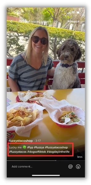 Fuzzy's Taco Shop のこの TikTok には、ブランド、関連性、トレンドのハッシュタグが混在しています。