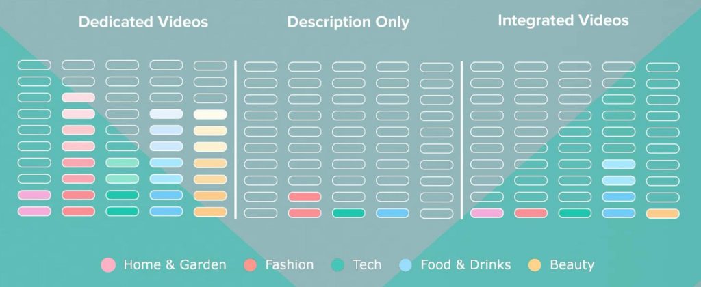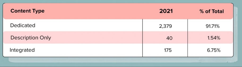 TikTokのスポンサー動画は、(1)専用、(2)統合、(3)説明のみの3つのコンテンツタイプのいずれかに分類されます。 プラットフォーム上のすべてのスポンサー動画のほぼ92%は専用動画です。つまり、動画全体がブランドスポンサーシップに捧げられています。 2番目に一般的なのは統合コンテンツタイプです。 統合された動画とは、ブランドスポンサーシップに対応しているものの、ブランドスポンサーシップに完全に専念しているわけではない動画です。 最後に、ブランドスポンサーシップが説明でのみ言及されている動画は最も一般的ではなく、全体の2%未満を占めています。