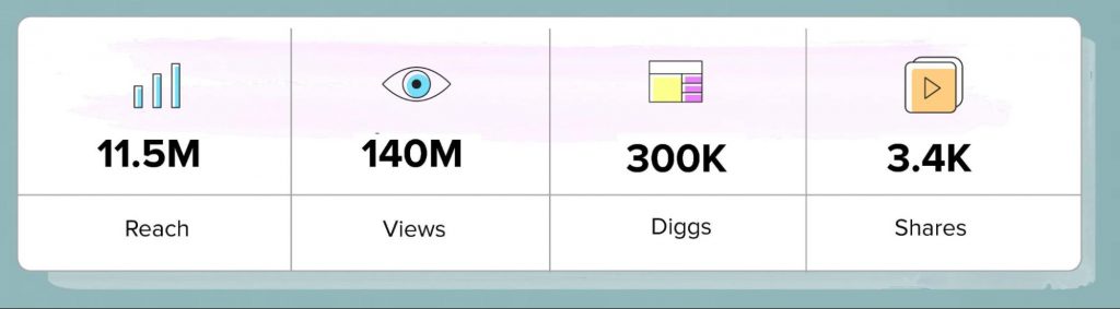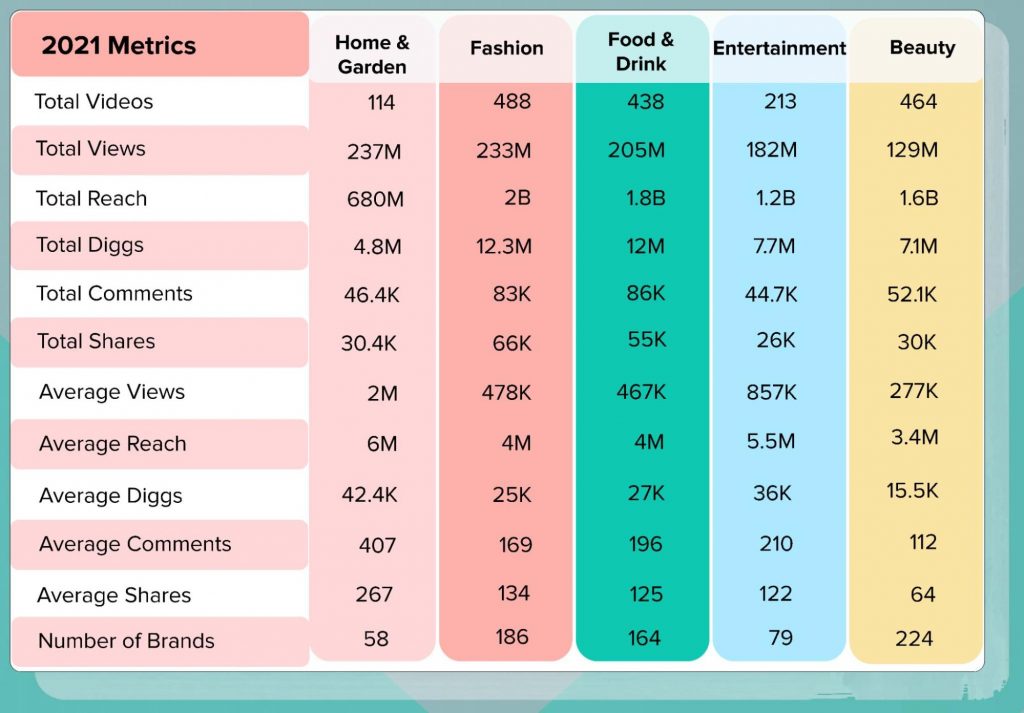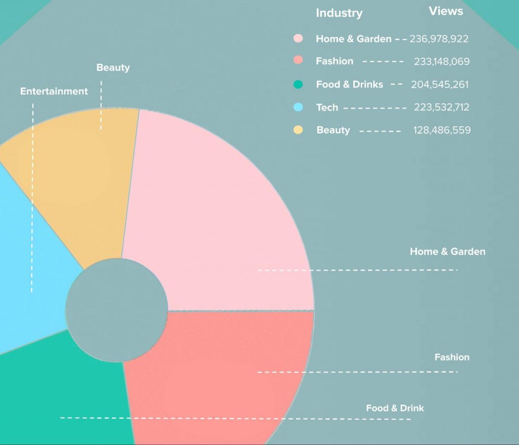 上位5つの業界を詳しく見てみましょう。 指標を並べて表示すると、ホーム&ガーデン業界は合計2億3,700万回の視聴回数を記録しましたが、ファッション業界はキャンペーンを通じて2億回のリーチで最も多くのユーザーにリーチしたことわかります。 しかし、業界の勝者を選ぶとすれば、他の4つの業界と比較して最も多くの見解とエンゲージメントを生み出したので、それは家庭と庭の業界になります。