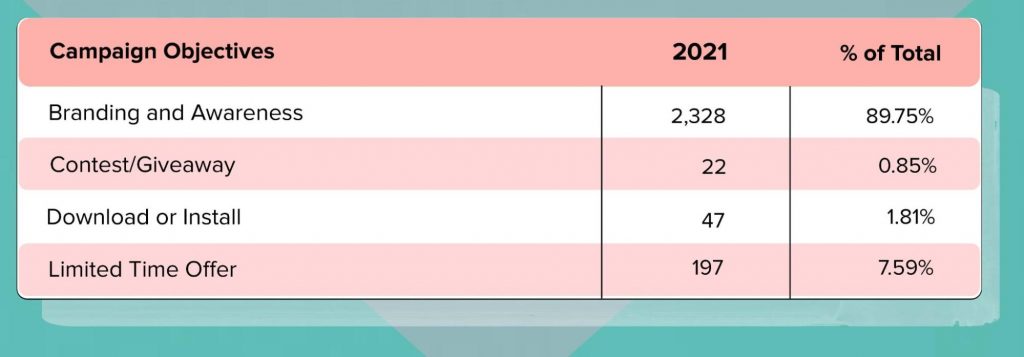 インフルエンサーマーケティングキャンペーンの主なキャンペーン目標は4つあります。 TikTokのスポンサービデオの圧倒的多数、ほぼ90%は、ブランディングと認知度というキャンペーンの目的を持っていました。 TikTokキャンペーンが生み出す膨大なリーチのため、これは理にかなっています。 動画の7%が期間限定オファーに対応していました。 残りの3%は、ダウンロードまたはインストールおよびコンテスト/プレゼントのカテゴリに分類されます。