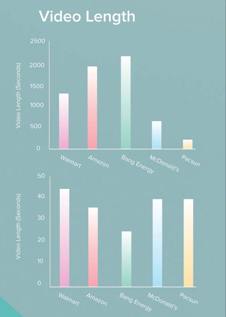 興味深いことに、Bang Energyは、他の4つのブランドと比較して平均ビデオ長が最も短くなっています。 彼らの平均は21秒でしたが、ウォルマートの平均の長さは43秒でした。