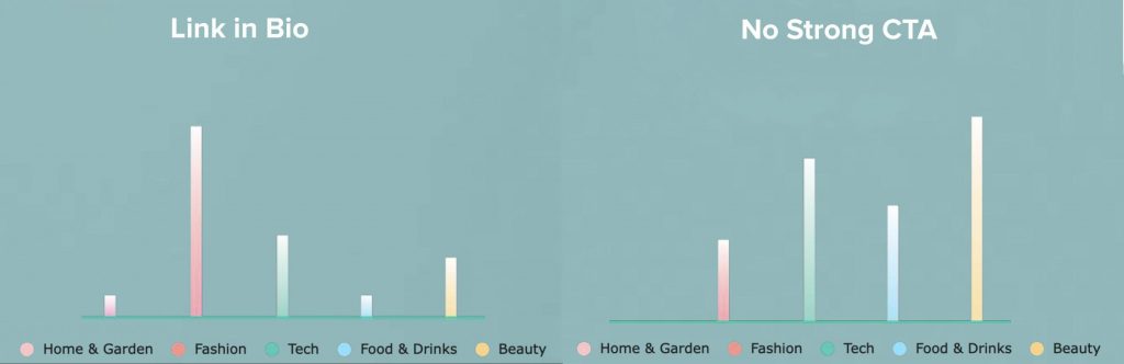 インフルエンサーマーケティングキャンペーンで使用される主な召喚状(CTA)は、(1)キャプションでタグ付けされたブランド、(2)バイオでのリンク、(3)プロモーションコードの3つです。 TikTokのスポンサー動画のほぼ3%には、強力な召喚状がありませんでした。 しかし、残りのビデオはすべて、3つの主要なビデオのうちの1つのカテゴリに分類されました。 最も人気のある召喚状は、動画のキャプションでスポンサーブランドにタグを付けることであり、動画の90%以上がこのCTAを使用しています。