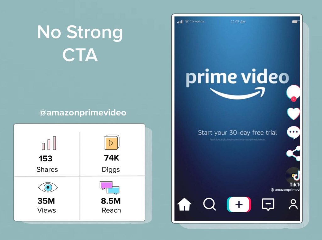TikTokのいくつかのスポンサー付き動画には、強力な召喚状がありませんでした。 このカテゴリに分類された最高のパフォーマンスのビデオは、@amazonprimevideoによるものでした。 この動画は3500万回の再生回数を記録し、 74K回の視聴を記録ました。