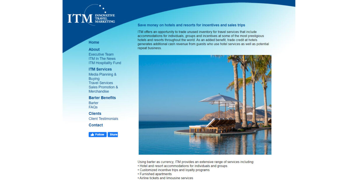 Innovative Travel Marketing (ITM) との提携により、旅行インフルエンサー マーケティングのニーズに独自のアプローチがもたらされます。 ITM は旅行業界向けのメディア プランニングとバイイングを専門とし、バーターの活用を通じてお客様の露出を最大化することに優れています。 彼らは売れ残った部屋や在庫を広告やマーケティング サービスと交換し、並外れた価値を提供します。 ホテルのプロモーションやバーター マーケティングにおける専門知識により、マーケティング予算を最大化する革新的な方法を模索しているホテル会社やホスピタリティ分野の企業にとって、同社は傑出した選択肢となっています。