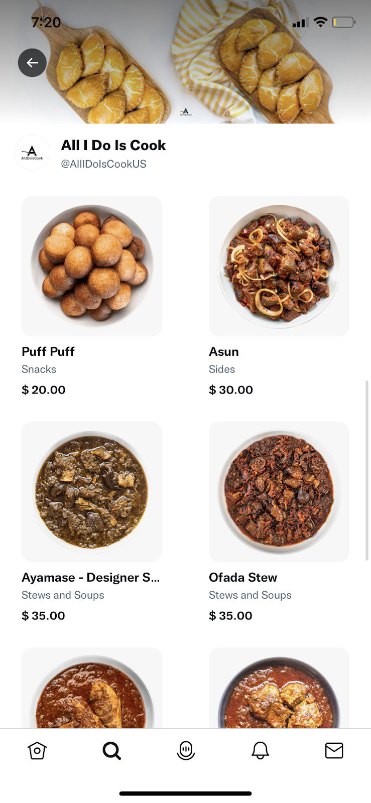 構造化された Twitter ショップは、スナック、サイド、シチューとスープなどのカテゴリに分割されており、購入者が製品を効果的にナビゲートできるようになっています。